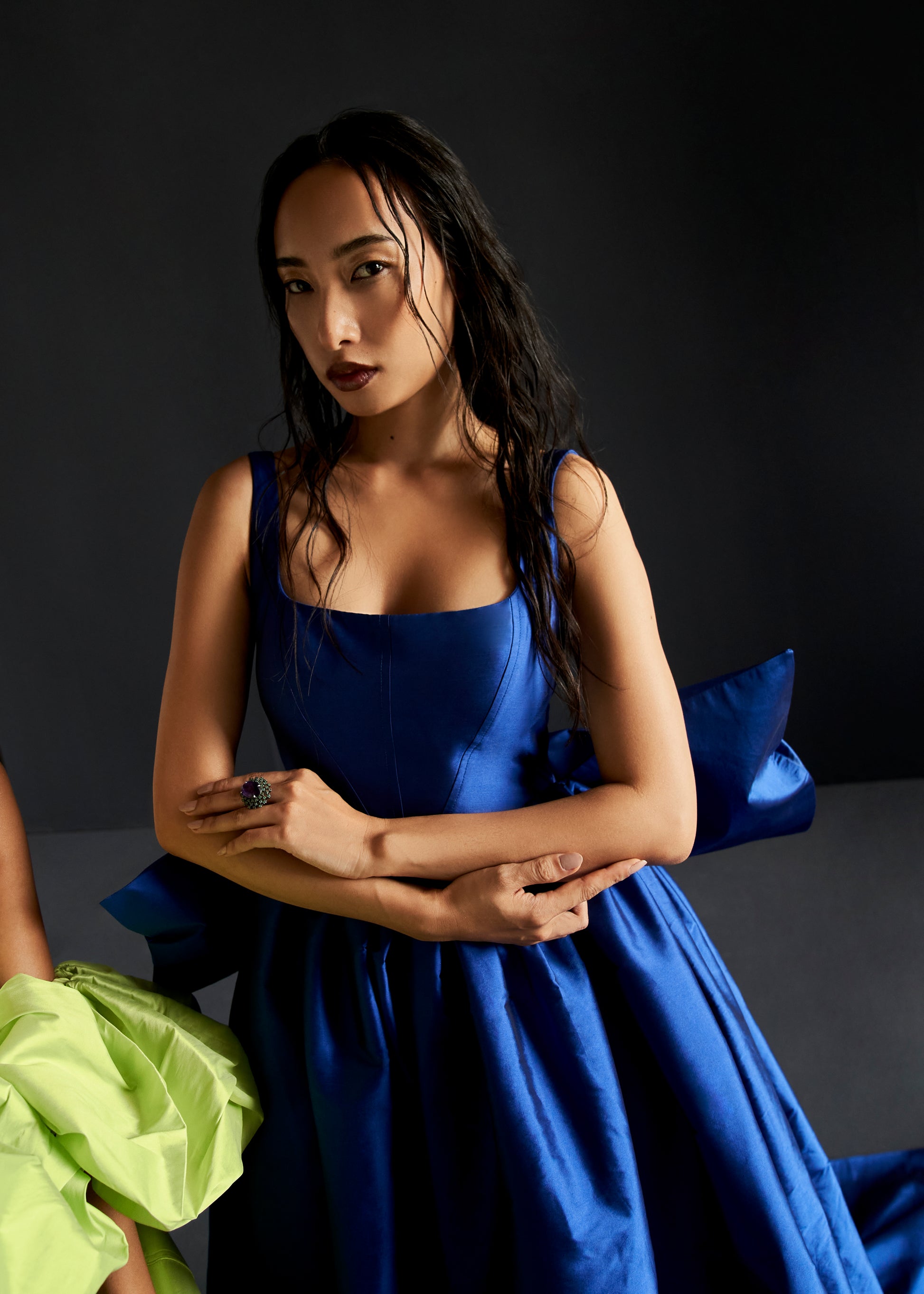 Style Tip: Pair it with tonal heels and sculptural statement earrings. Keep hair in soft waves or a sleek ponytail to let the neckline and trail take center stage.
