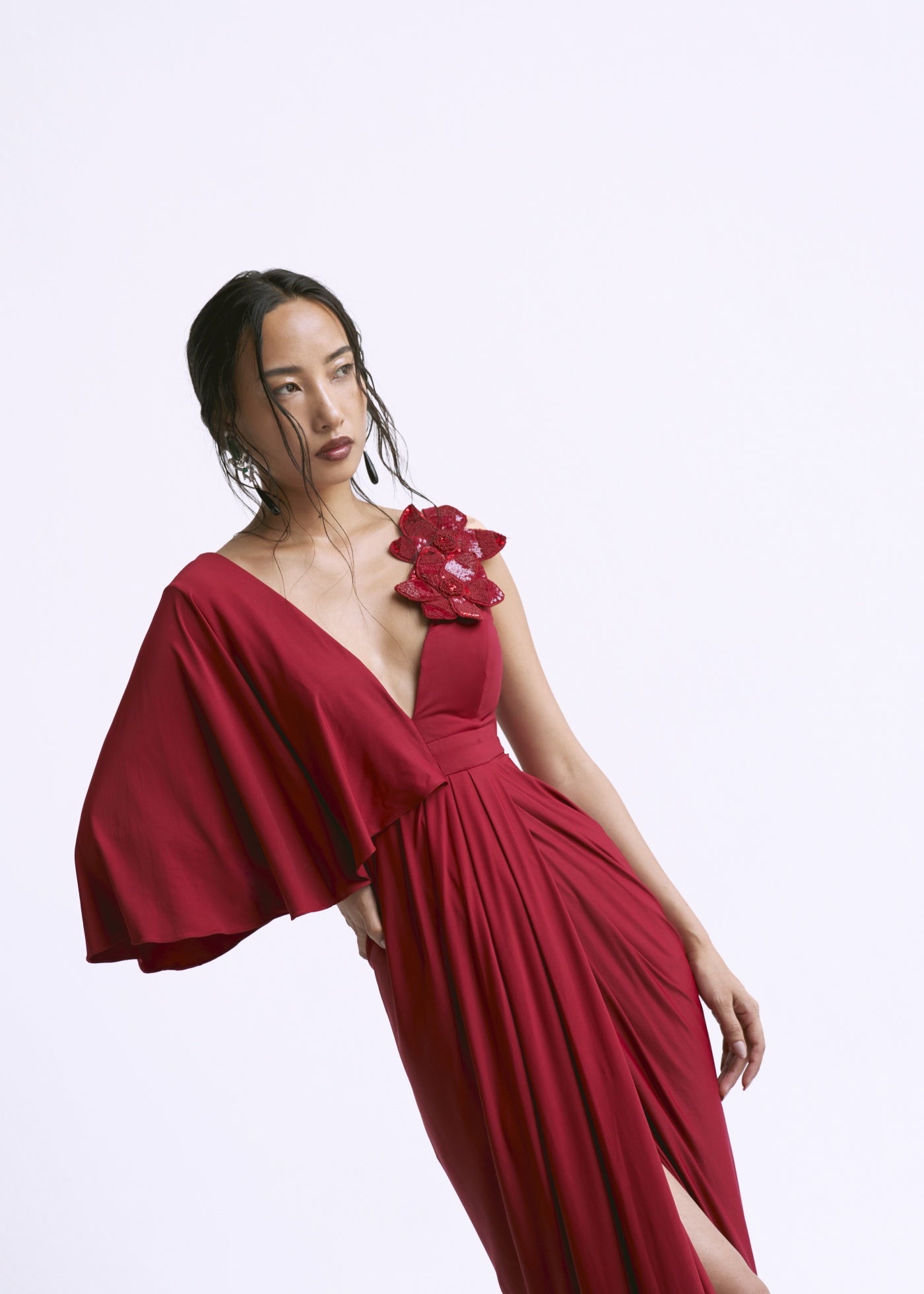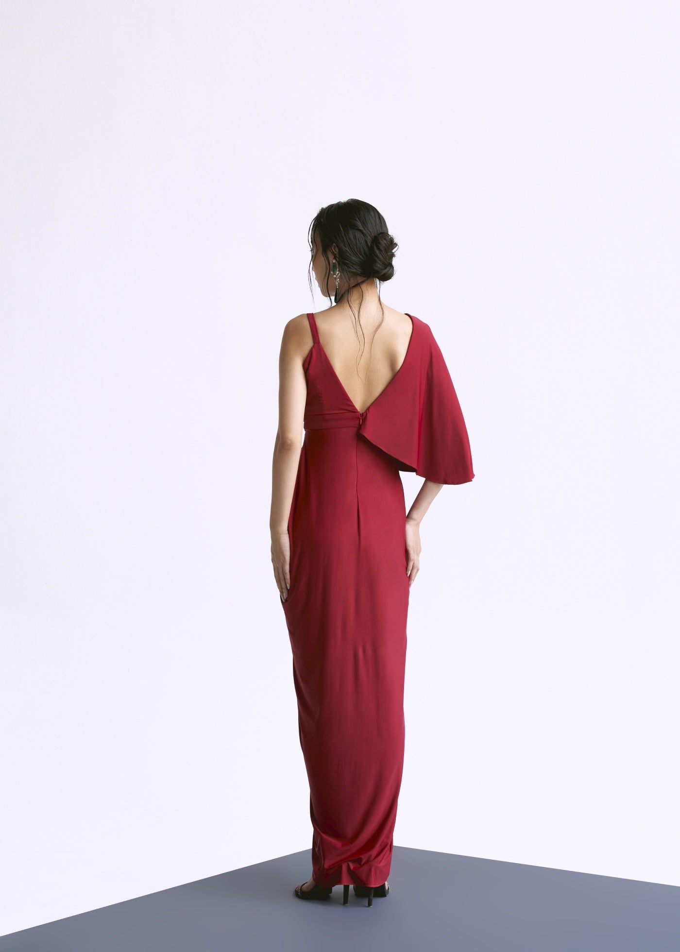 An asymmetric play of drapes and structure, the Veira Gown features a flattering ruched waist that artfully conceals the midriff, creating an effortlessly slimming silhouette. Designed with a deep neckline and a statement one-shoulder cape detail, this gown is elevated with a tonal floral appliqué for a soft, sculptural finish. Customisable with a higher neckline on request.