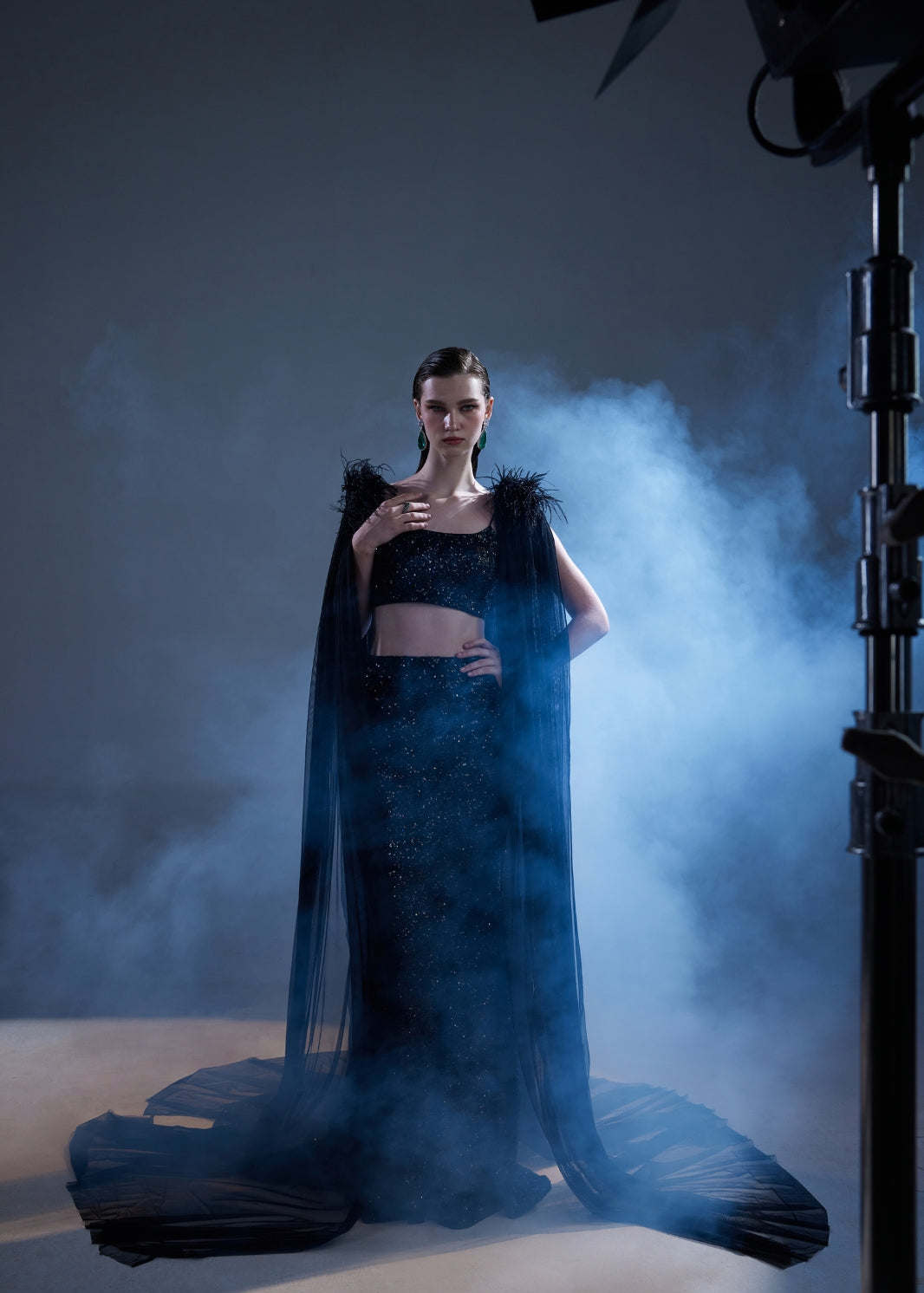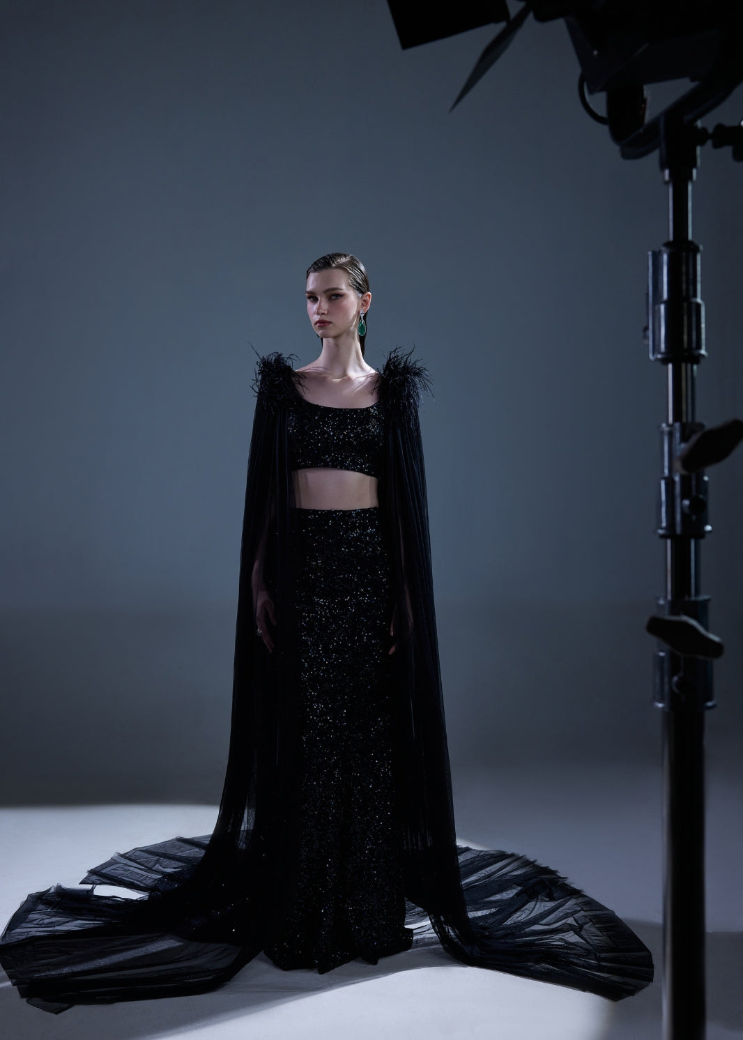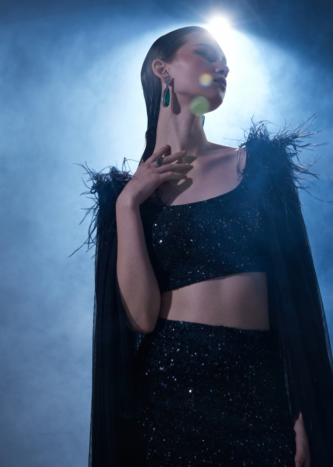 A noir three-piece ensemble drenched in hand-embroidered sequins and tonal beadwork. The set features a cropped square-neck blouse, a high-waisted fishtail skirt, and a dramatic sheer tulle cape with feather detailing at the shoulders and a floor-grazing train. Modern, sculptural, and unapologetically bold.