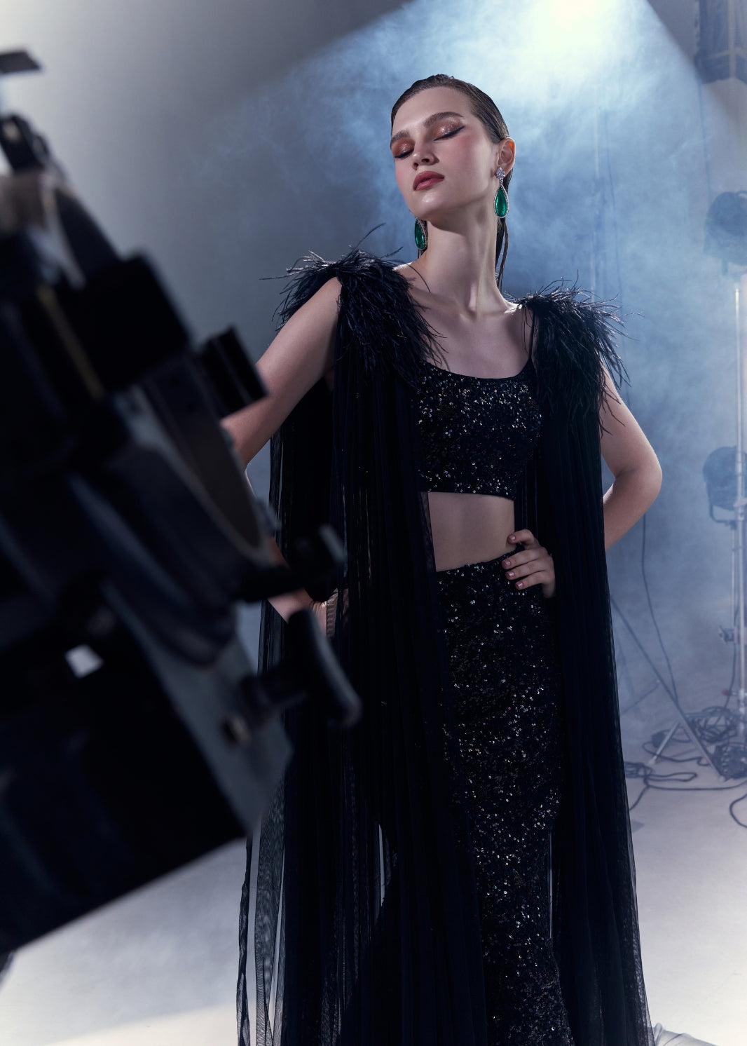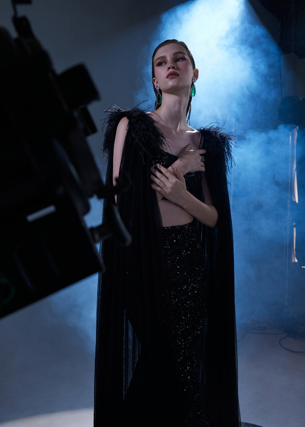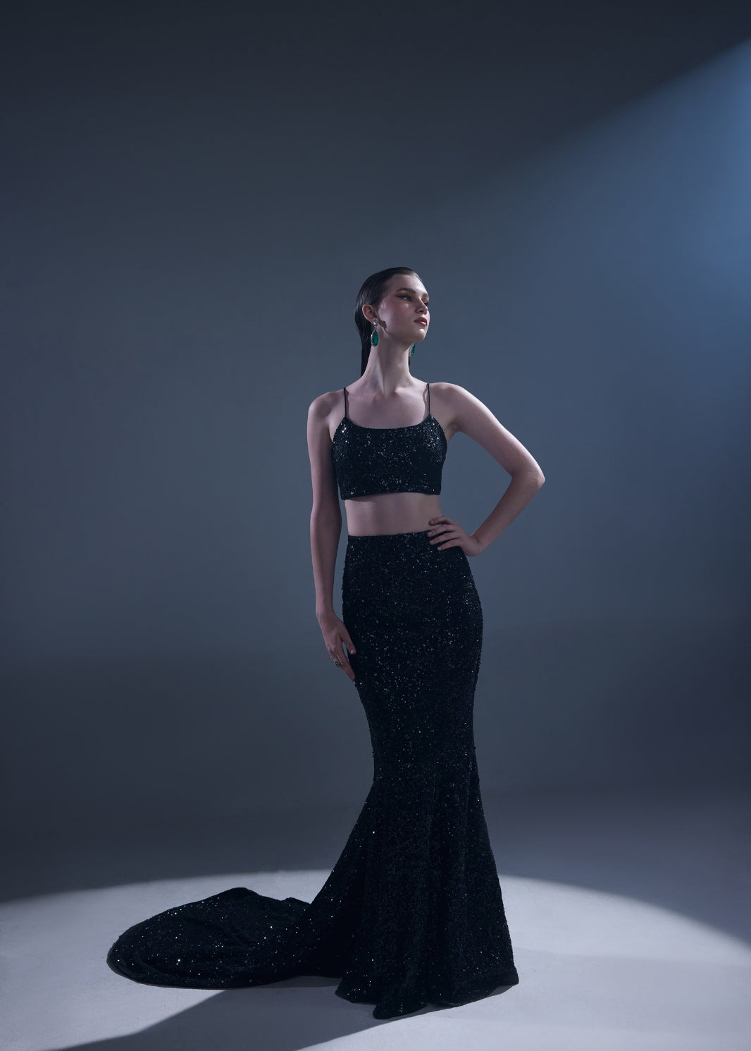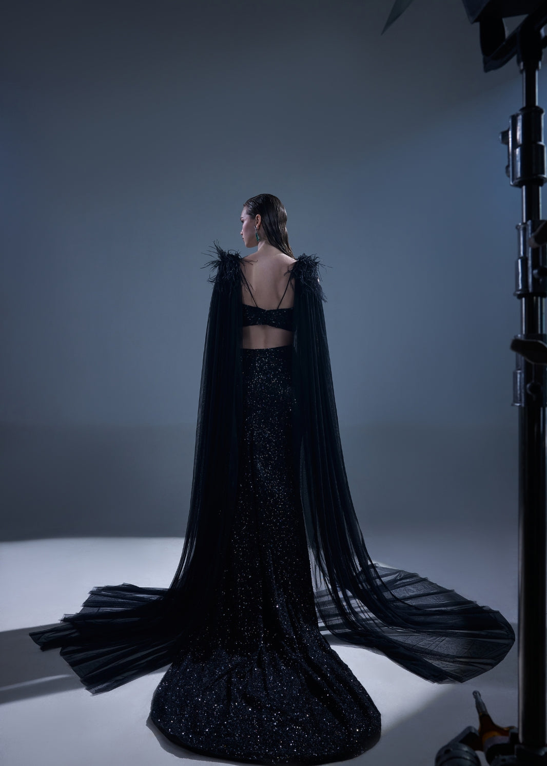 A noir three-piece ensemble drenched in hand-embroidered sequins and tonal beadwork. The set features a cropped square-neck blouse, a high-waisted fishtail skirt, and a dramatic sheer tulle cape with feather detailing at the shoulders and a floor-grazing train. Modern, sculptural, and unapologetically bold.