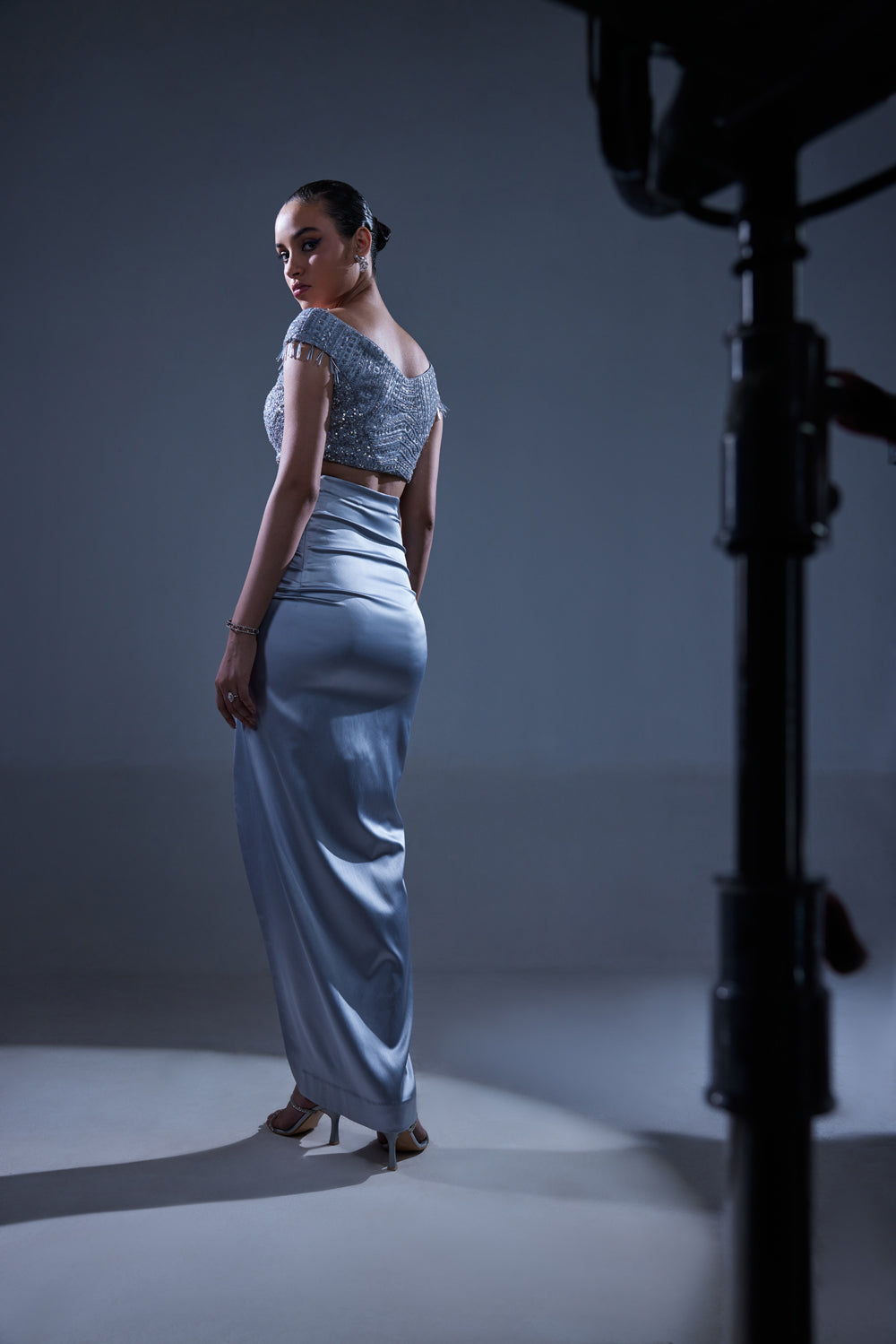 A pale grey satin co-ord set featuring a heavily embellished off-shoulder crop top, detailed with delicate bead tassels at the sleeve edge. The high-slit skirt is finished with a structured cascading ruffle, adding movement and architectural drama to the silhouette. Each piece can be styled solo — the top paired with high-rise trousers, the skirt with an understated camisole.