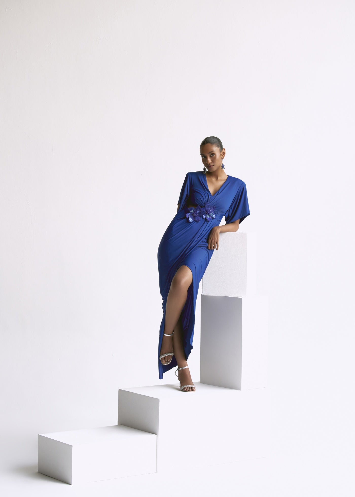 The Raina Gown is designed to flatter and elongate — with a gently draped front and cinched waist detailed in tonal floral appliqué. The artful ruching across the waistline subtly conceals the stomach, making it beautifully forgiving and slimming. A side slit adds ease of movement and understated drama. You can also request a higher neckline for a more covered, bespoke finish.