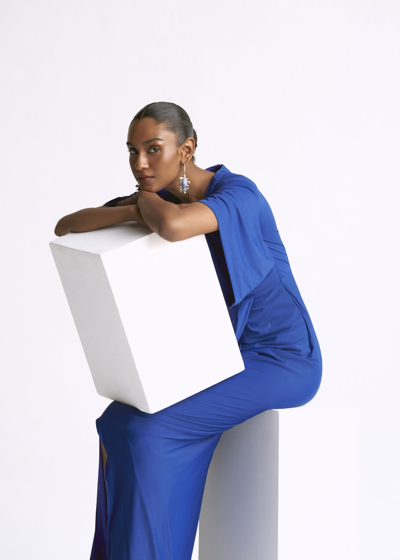 Style Tip: Pair it with statement earrings and metallic heels for an evening look, or contrast its fluidity with a tailored jacket or structured overcape for a sharper edge.
