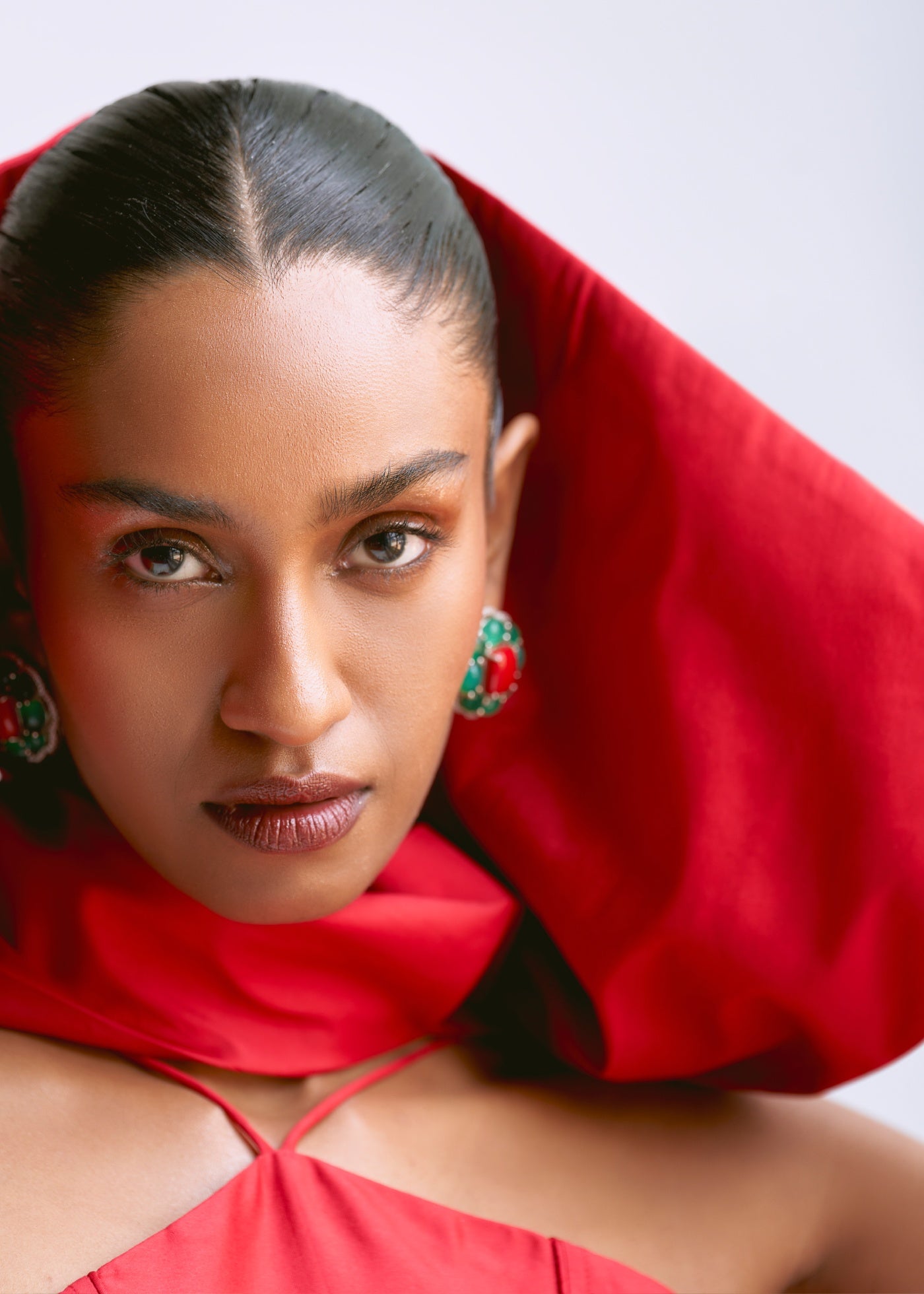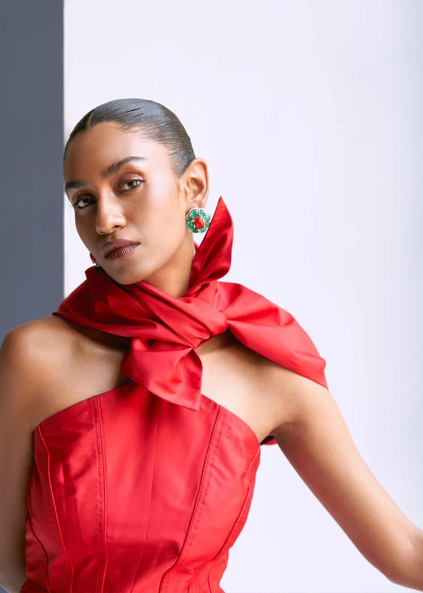 Cut from lustrous taffeta, the Scarlet Dress is a bold, contemporary silhouette in a rich crimson hue. Designed with a structured bodice and delicate cross-halter straps, it’s finished with a detachable sash belt that cascades gracefully at the side. Crisp in texture and tailored to a flattering midi length, it’s a striking statement for after-dark occasions.