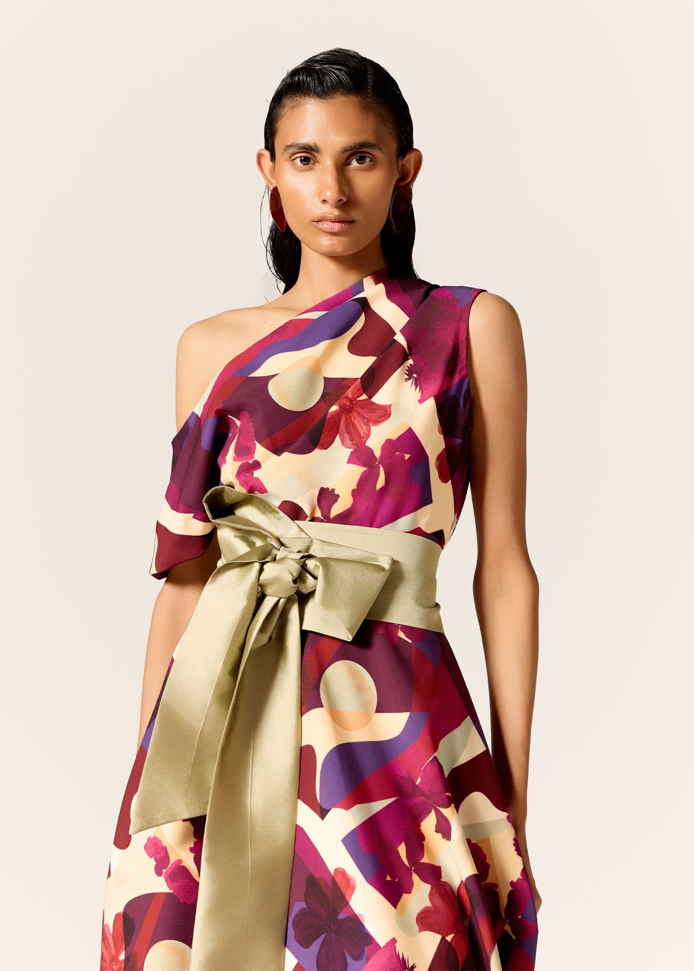 The Vela One-Shoulder Dress is crafted in our signature in-house abstract floral print. Designed with an asymmetric neckline, soft sleeve drape, and finished with a detachable taffeta belt, it’s a striking yet effortless silhouette.